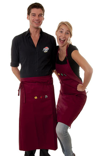 Onze in-house designer ontwerpt enkele tekeningen in lijn met de huisstijl van de klant. Deze worden verder uitgewerkt en er worden matentabellen opgesteld. Slechts na goedkeuring van pas- en kleurstalen wordt productie opgestart. Hierbij enkele recente en minder recente voorbeelden van Pizza Hut.